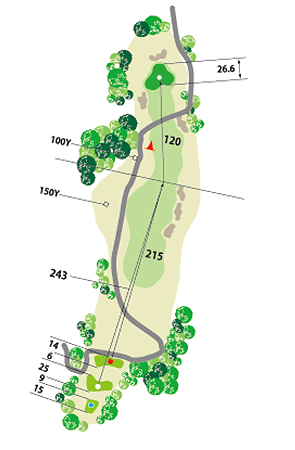 ティーショットは高低差のある打ち下ろし。 叩き過ぎて曲げないように。 セカンド・ショットは距離はないが、打ち上げなので、ちょっと大きめに打つのがいい。